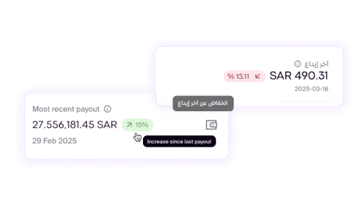 نظرة مباشرة على تغيّر إيراداتك بين آخر إيداعين داخل صفحة المدفوعات، توضح الفرق من إيداع لإيداع وتساعدك تفهم اتجاه الأداء المالي بسرعة، بدون الحاجة لتقارير أو مقارنة يدوية.