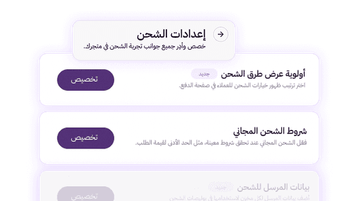 دمج إعدادات الشحن في صفحة واحدة تشمل ترتيب خيارات الشحن، الشحن المجاني، وقيود الشحن، لتسهيل الوصول والإعداد.