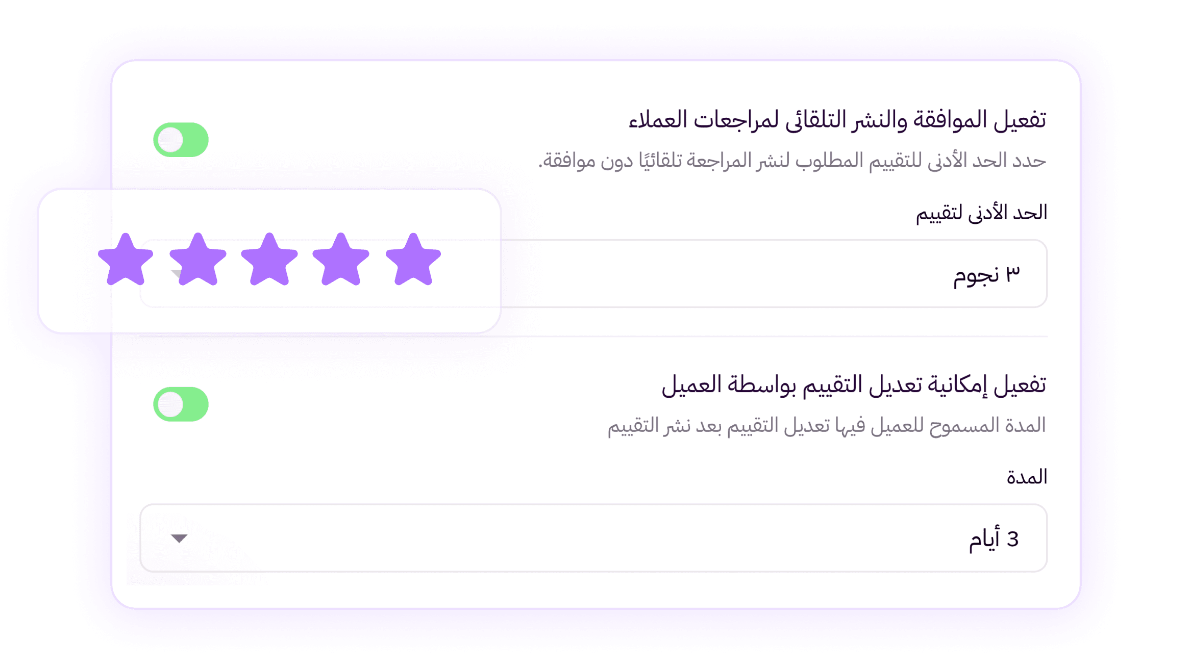 نشر تلقائي للتقييمات حسب عدد النجوم، مع فترة تعديل للعميل تضمن دقة التقييم وجودته قبل ظهوره في متجرك.